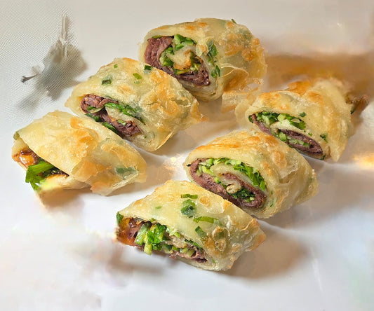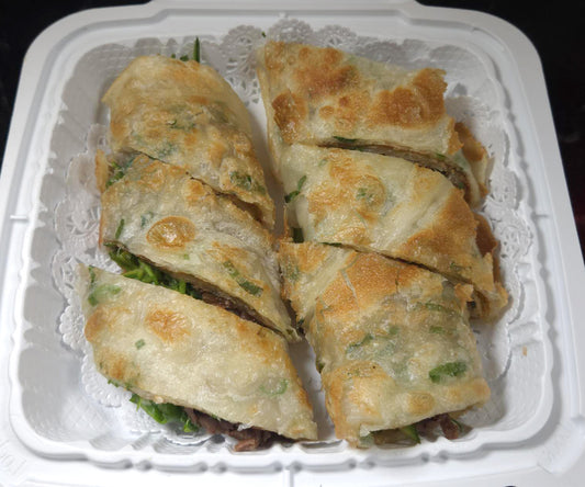 Introducing our exquisite Beef Scallion Pancake Rolls, a masterpiece of Chinese cuisine that promises a symphony of flavors in every bite. Each roll is a harmonious blend of tender, marinated beef and fresh, aromatic scallions, wrapped in a crispy, golden pancake that's delicately pan-fried to perfection. The crispy exterior contrasts beautifully with the succulent beef, creating a textural delight that's both satisfying and flavorful.